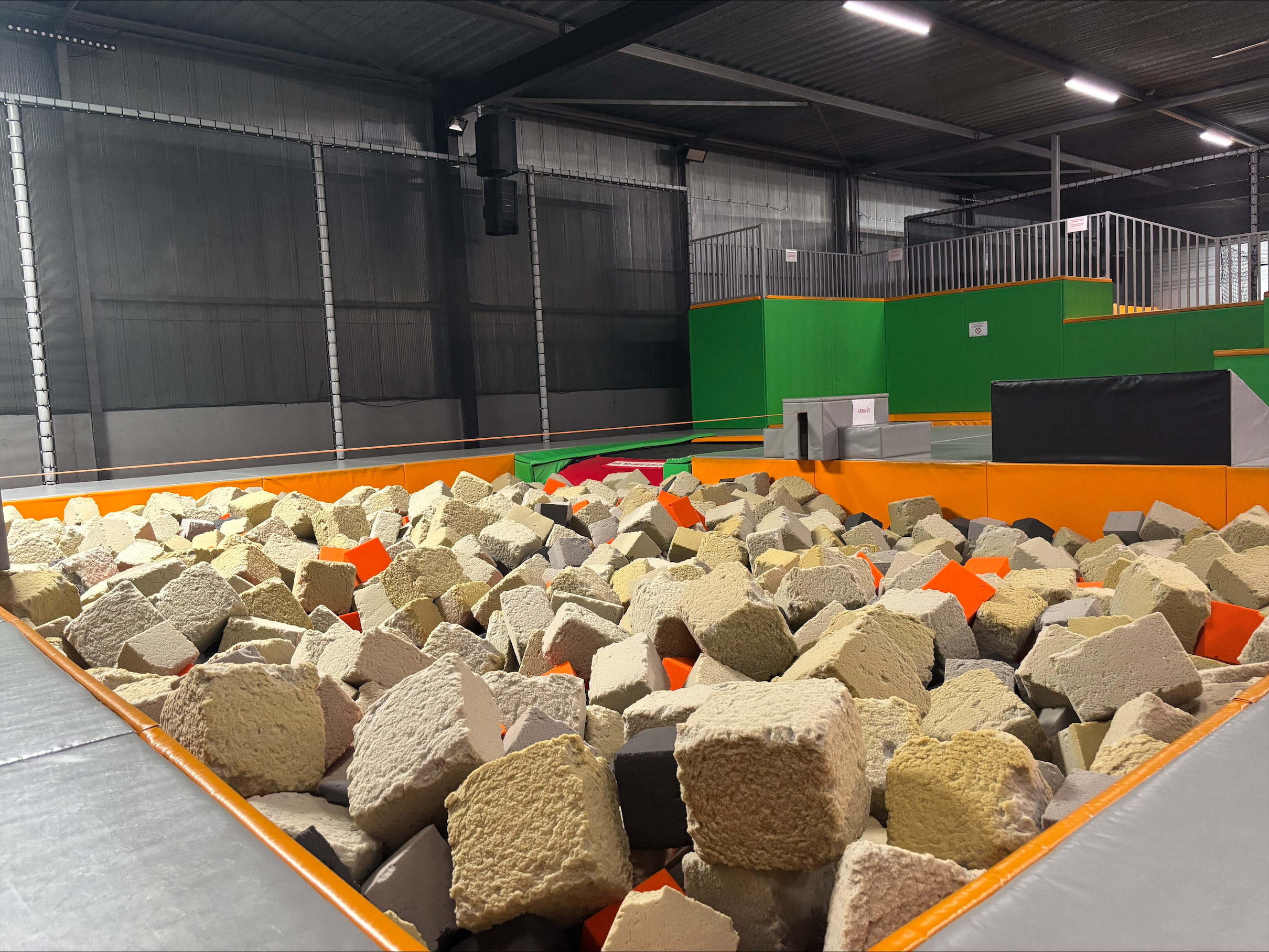 Le Bac à mousse, c'est ce gros bac rempli de milliers de cubes en mousse au bord duquel se situent plusieurs activités : Tramplin, Trampoline et Slack Line.